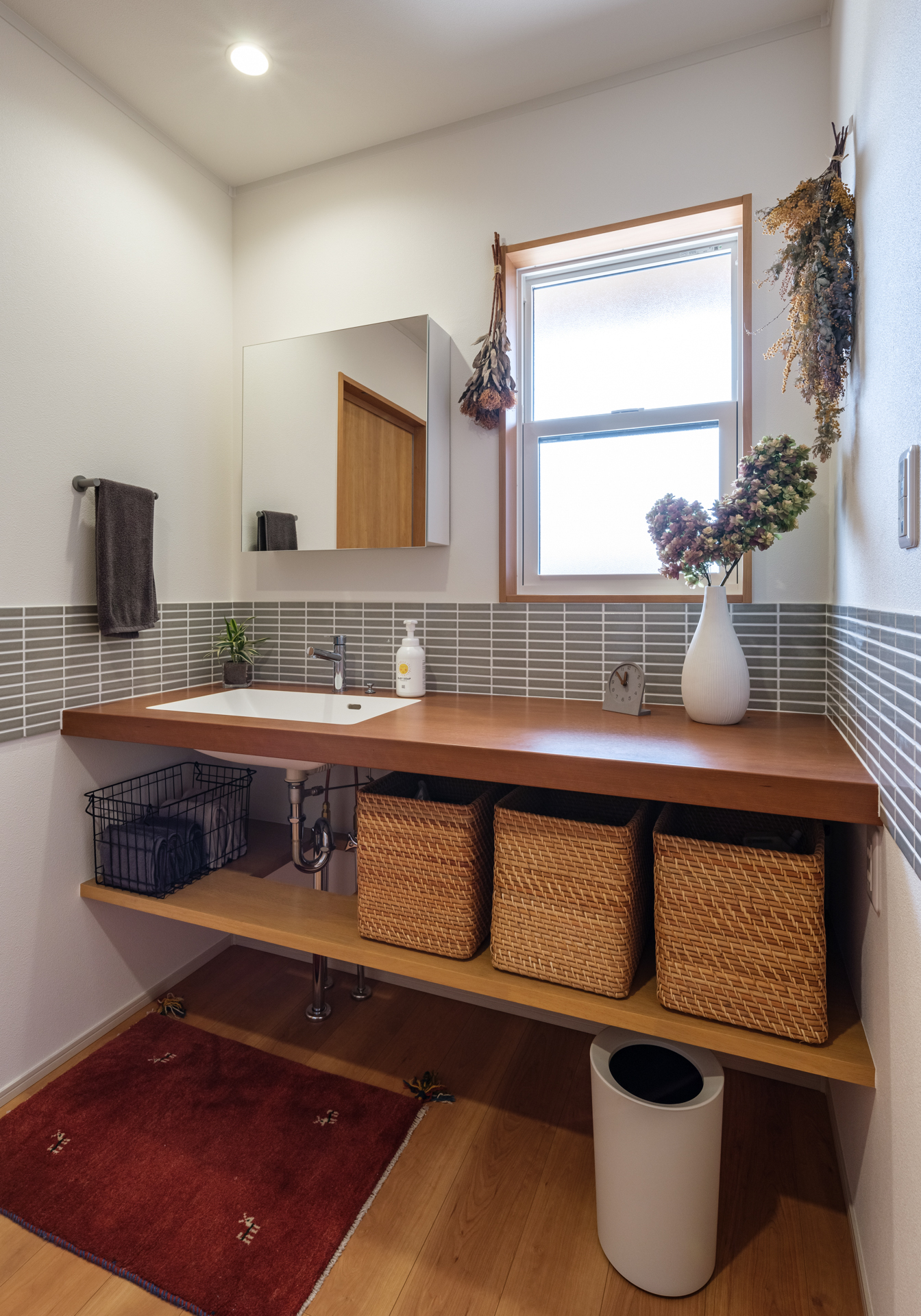 こちらは、洗面所にタイルを張っています。落ち着いたトーンのお色です。