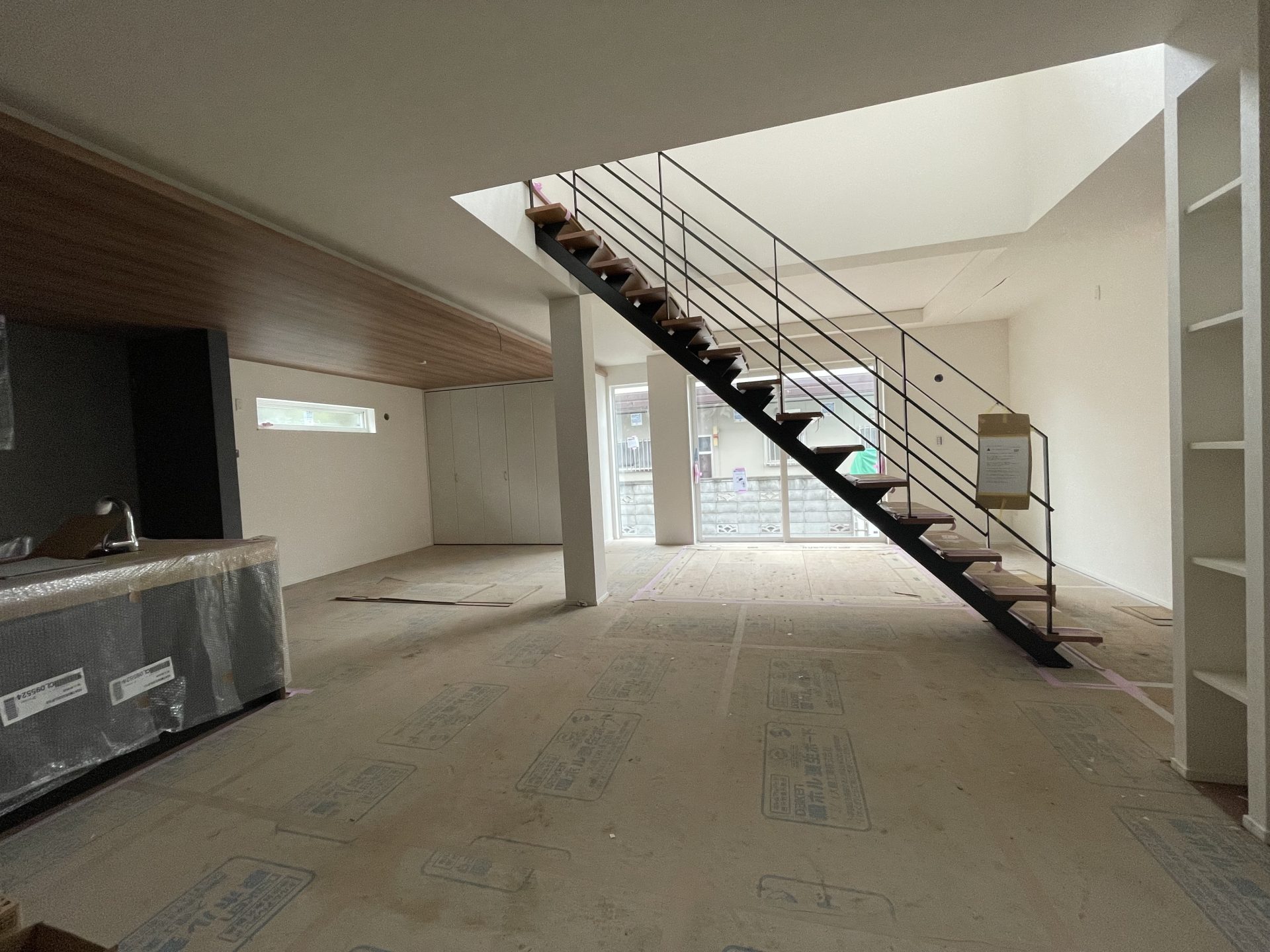 この空間を緩やかに間仕切る位置に鉄骨階段を配置しました。