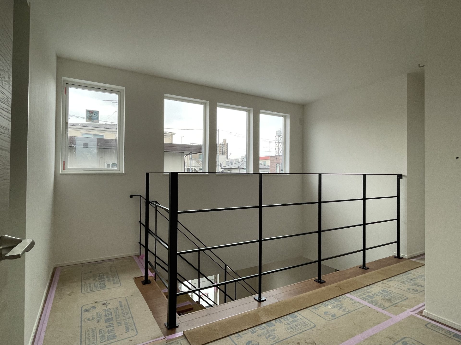 2階のホールも手すりを鉄骨にして「抜け」を意識しています。