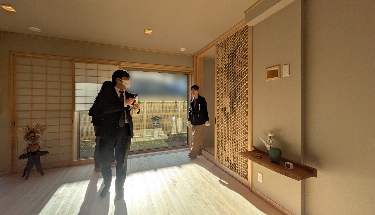 お家に入ってまず広がるLDK。そこからは隣地からの視線を遮りながら南庭を望める雪見障子を設け、日のあたたかさだけでなく景色も取り込み、空間の広がりを感じられるようになっていました。
