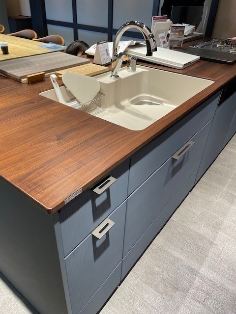 そこでなんと、ワークトップが木製のキッチンの展示が!!