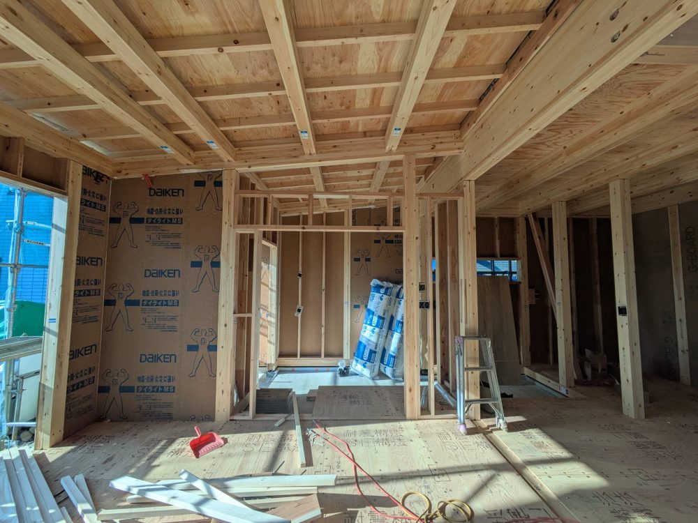 約一週間前の上棟から、壁と屋根が貼られたことで、だんだんとお家の全体像が見えてきました。
