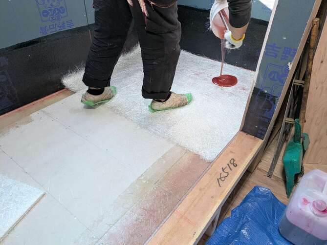 下地の施工⇒プライマー塗布⇒ガラスマット敷き込み⇒樹脂を塗布⇒硬化後研磨⇒トップコート仕上げ