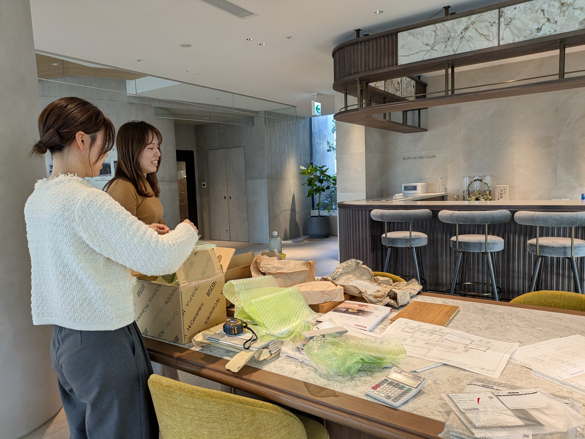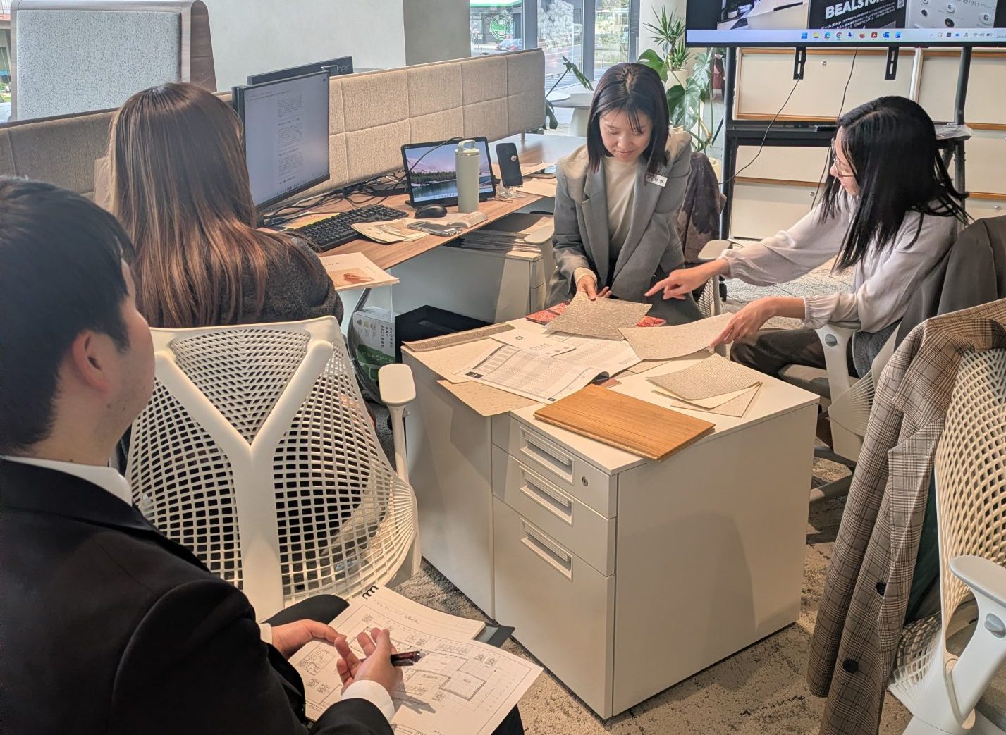 ミーティングでは、届いたサンプルを一つひとつ並べながら、「この素材はどんな空間に合うか」「実際の暮らしの中でどう見えるか」といった視点で意見を出し合い、じっくりと検討を重ねました。